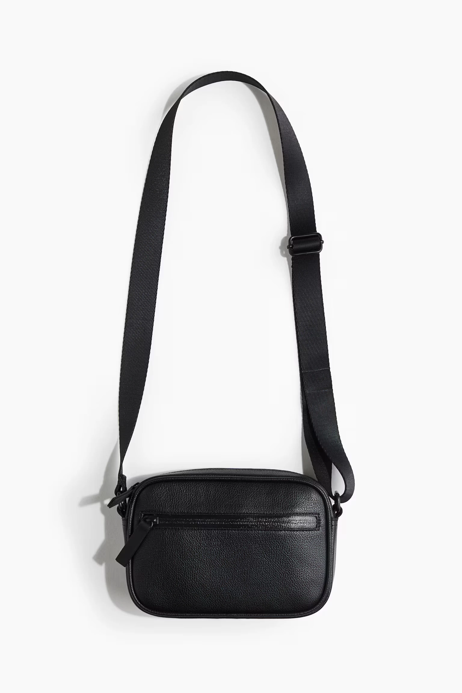 Crossbody bag in coated fabric with a zip at the top and an adjustable shoulder strap with a metal slide buckle. One zipped outer compartment and two open inner compartments. Lined. Depth 5.5 cm. Height 14 cm. Width 22.5 cm